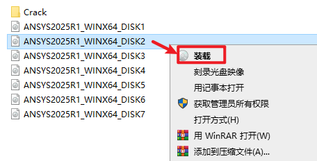37.返回安装文件夹,选中“ANSYS2025R1_WINX64_DISK2”iso文件,右键选择“装载”