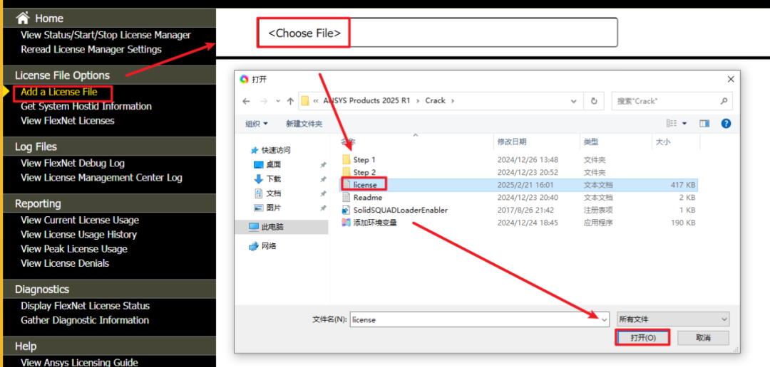 20.返回证书管理中心“ANSYS License Manager Center“界面,点击”Add a License File” ,点击”Choose File” ,找到并选中”license.txt” 文件,点击 “打开”
