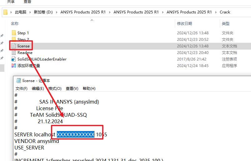17.返回安装文件夹,双击打开“Crack”文件夹,打开“license.txt”文本文件,在文本中找到“XXXXXXXXXXXX”