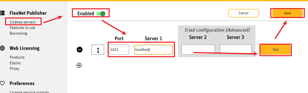 68.选择“Lisence servers”,点击“Enabled“旁边的打开按扭,在“Port”下面的框里输入:1055,在“Server1”下面的框里输入:localhost,点击“Test”,旁边出现绿色的勾,点击”Save“保存