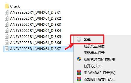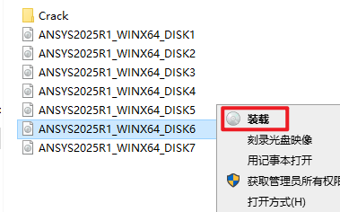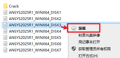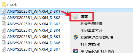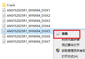 2.打开刚刚解压的文件夹,选中“ANSYS2025R1_WINX64_DISK1”iso文件,右键选择“装载”(如果没有“装载”选项的可以右键选择“打开方式—Windows资源管理器”打开)