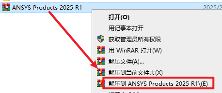 1.选中下载的压缩包,然后右键选择解压到“ANSYS Products 2025 R1”